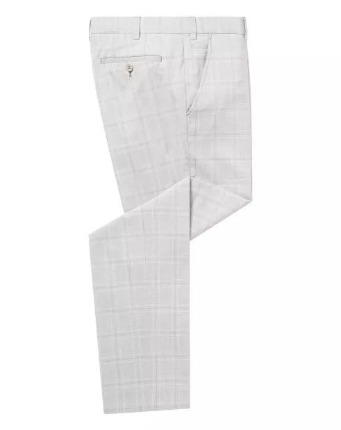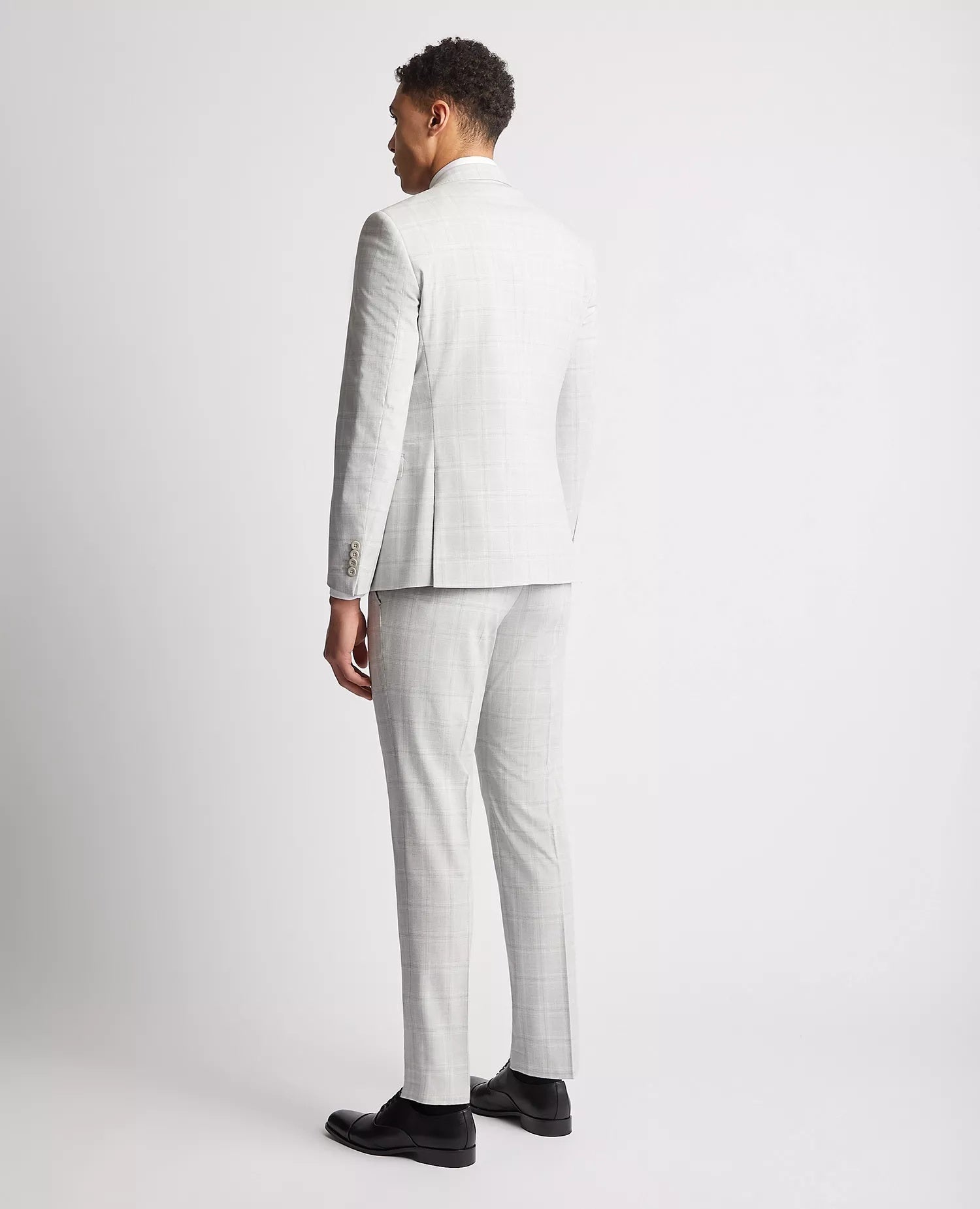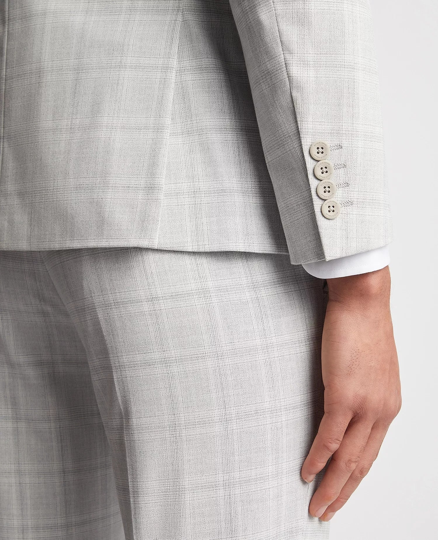 Soft grey with a refined check pattern, this slim fit suit jacket offers a polished, contemporary look. It features sharp peak lapels, a single-breasted two-button fastening, straight flap side pockets, and side vents for comfort and ease of movement.