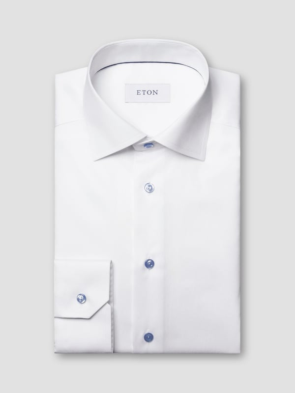 Suited for any occasion, this dress shirt is cut from our beloved Signature Twill. This iconic Eton material, perfected over two decades, is made to last, and keep you looking wrinkle-resistant. Updated with organic cotton, a blue piping inside the front placket, and matching buttons for a sophisticated and sleek look.