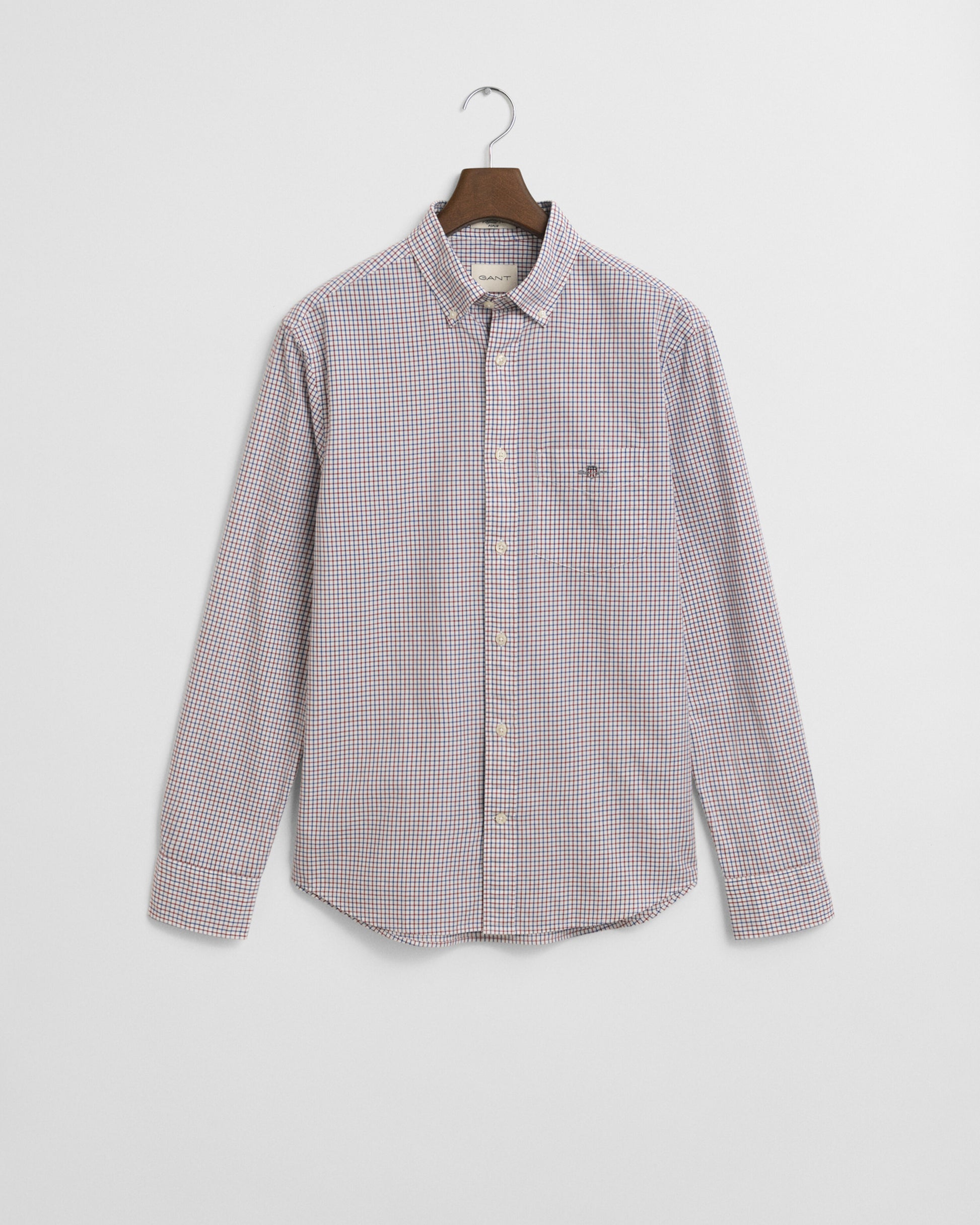 Crafted in a durable cotton poplin, this shirt is essential to any preppy wardrobe. Patterned with yarn-dyed micro checks, this shirt is cut for a regular fit and features a button-down collar, curved hem and a box pleat with our signature locker loop at the back. It is accented with an '80s-inspired GANT shield graphic embroidered at the chest pocket.