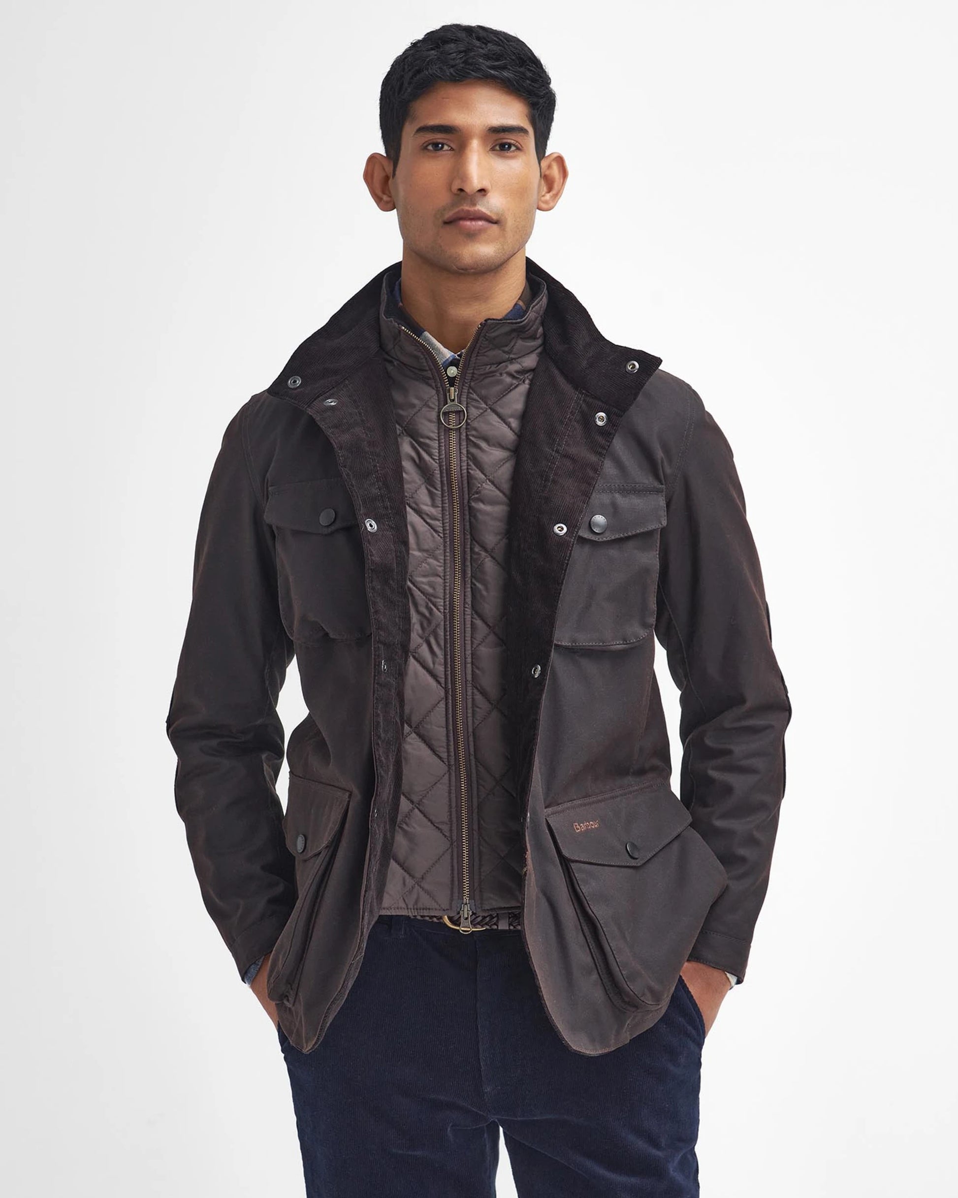 Smart and stylish, the Ogston is a hard-working jacket cut for a relaxed, masculine fit and crafted in Barbour’s heavyweight Oban waxed cotton, which offers robust weather defence with a suede-like matte finish. An integral quilted vest creates an outdoorsy look and provides an extra layer of warmth, fastening through to a stand collar with a Barbour branded zip. The outer jacket itself adds yet more practicality with hardy stud fastenings and four roomy pockets, plus distinctive details including leather elbow patches corduroy facings. The luxurious wool-mix lining adds an air of elegance and refinement to this rugged winter jacket.