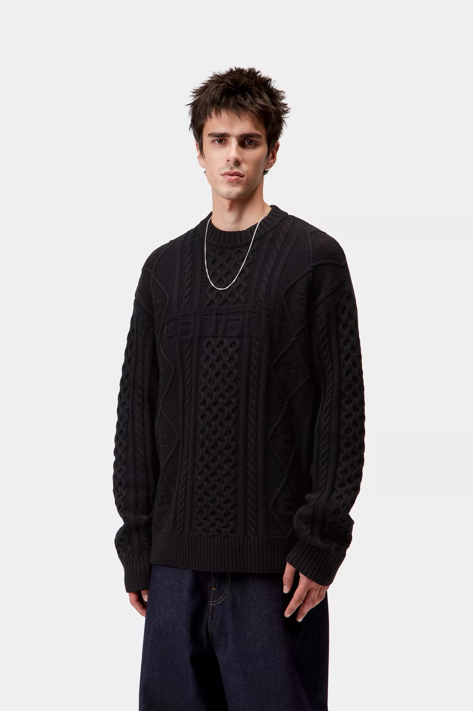 The Shawn Sweater is made from a heavyweight blend of cotton and acrylic yarn. It has cable-knit design on the front and sleeves. A Script Logo appears on the chest.
