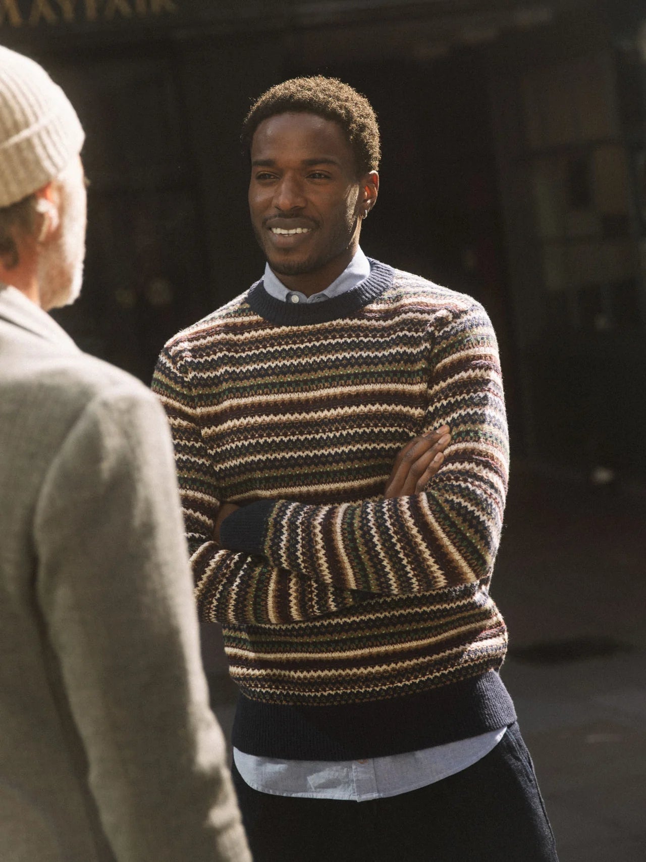 This jacquard knit pullover stands out with its multi-coloured stripe pattern and chunky silhouette. Made from a wool-cotton blend, it features ribbed trims and a discreet logo at the back. Bold yet wearable, it’s an instant statement for cooler days.