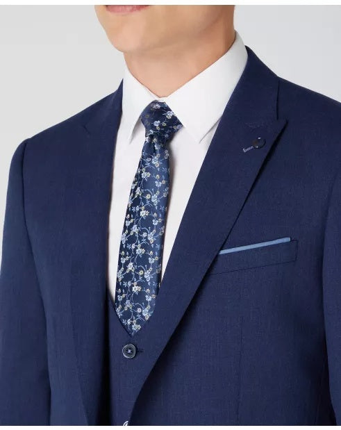 Elevate your style with this blue slim fit suit jacket crafted from a luxurious wool-rich blend. Featuring sharp peak lapels, a single-breasted two-button closure, side vents, and straight flap pockets, this jacket offers a modern, tailored silhouette perfect for formal occasions or smart office wear.