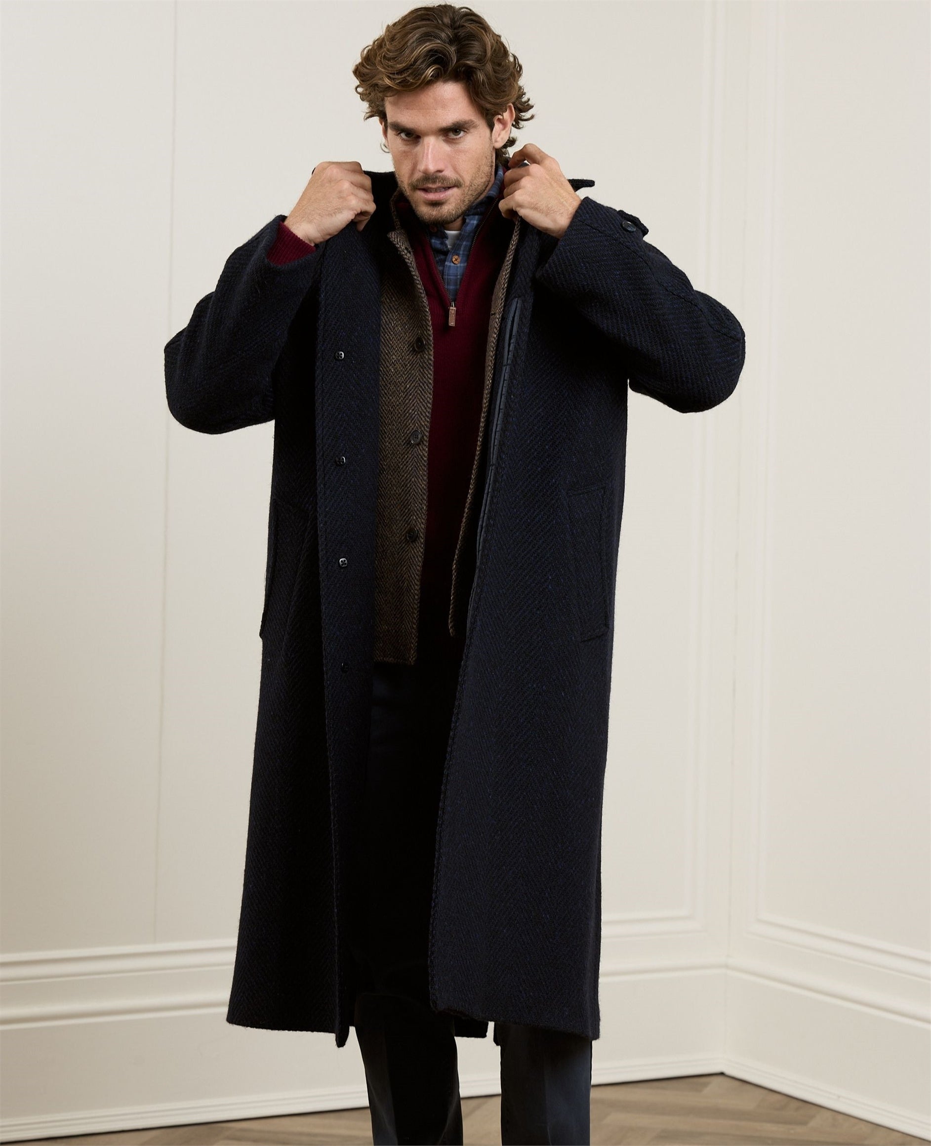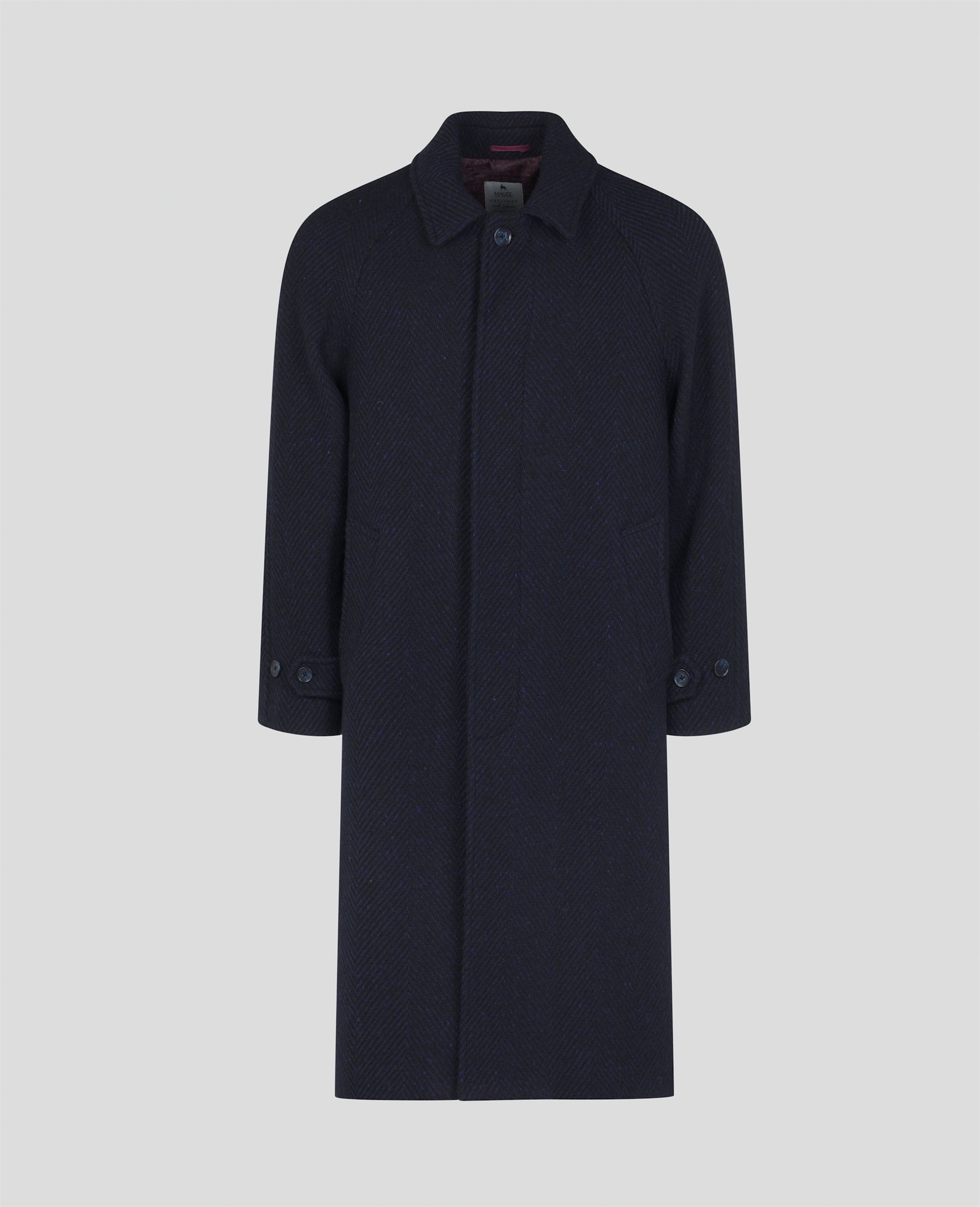 The Corrib is one of our most iconic men's tweed coats, the oversized style with raglan sleeves is designed to be worn over suits and jackets. This luxurious wool herringbone in navy tweed with tonal blue flecks was inspired by our surrounding landscape and produced in our mill in Donegal.