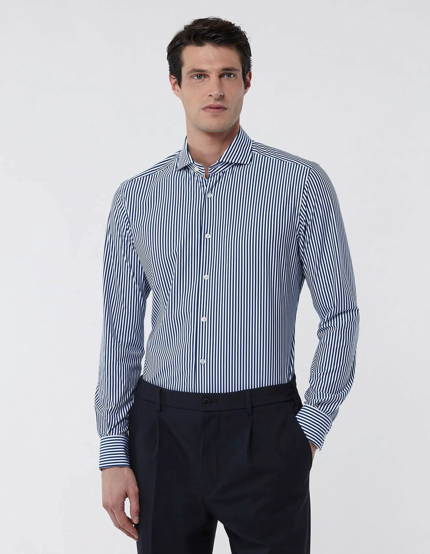 Men's shirt with cutaway collar, updated and with new dimension design. The tailor fit is the best possible combination of comfort and up-to-the-minute volume. Single-needle stitching with 7 stitches per centimetre, gussets on the bottom, removable stiffeners and stems with heat-welded silk yarn for each, single button. This shirt is a must-have for any man's wardrobe and can be wom anywhere.